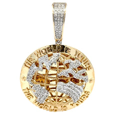 This exquisite pendant features a detailed world map design, beautifully crafted in gold and adorned with sparkling diamonds. The phrase 'The World Is Yours' elegantly encircles the globe, making it a perfect statement piece for those who love to travel or seek adventure.