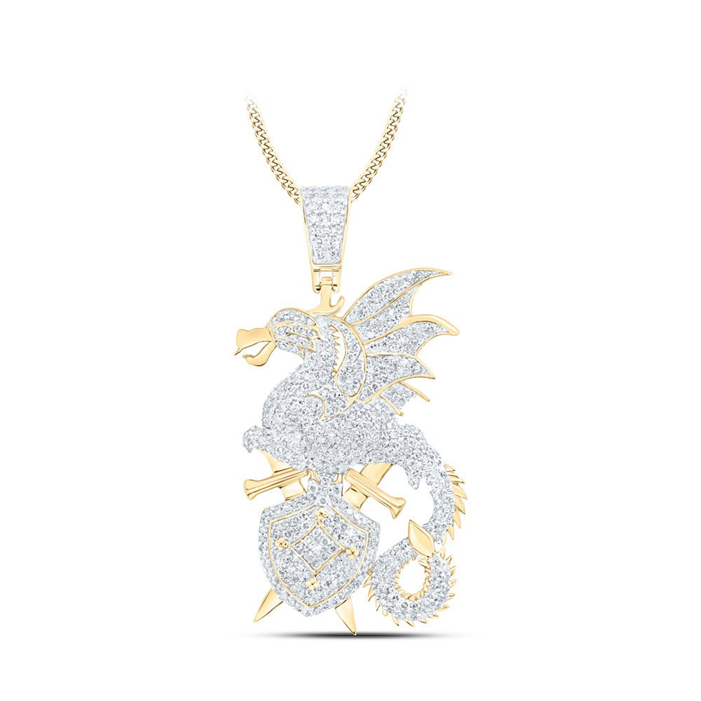 10kt Yellow Gold Mens Round Diamond Dragon Sword Shield Charm Pendant 1-5/8 Cttw