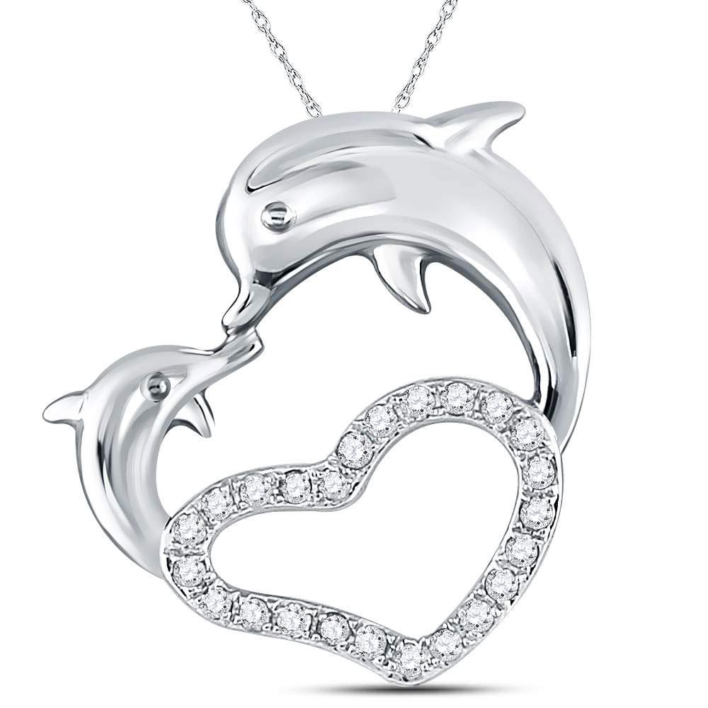 14kt White Gold Womens Round Diamond Double Dolphin Heart Pendant 1/6 Cttw
