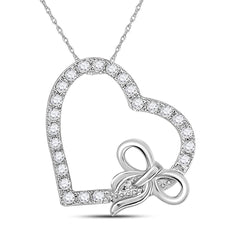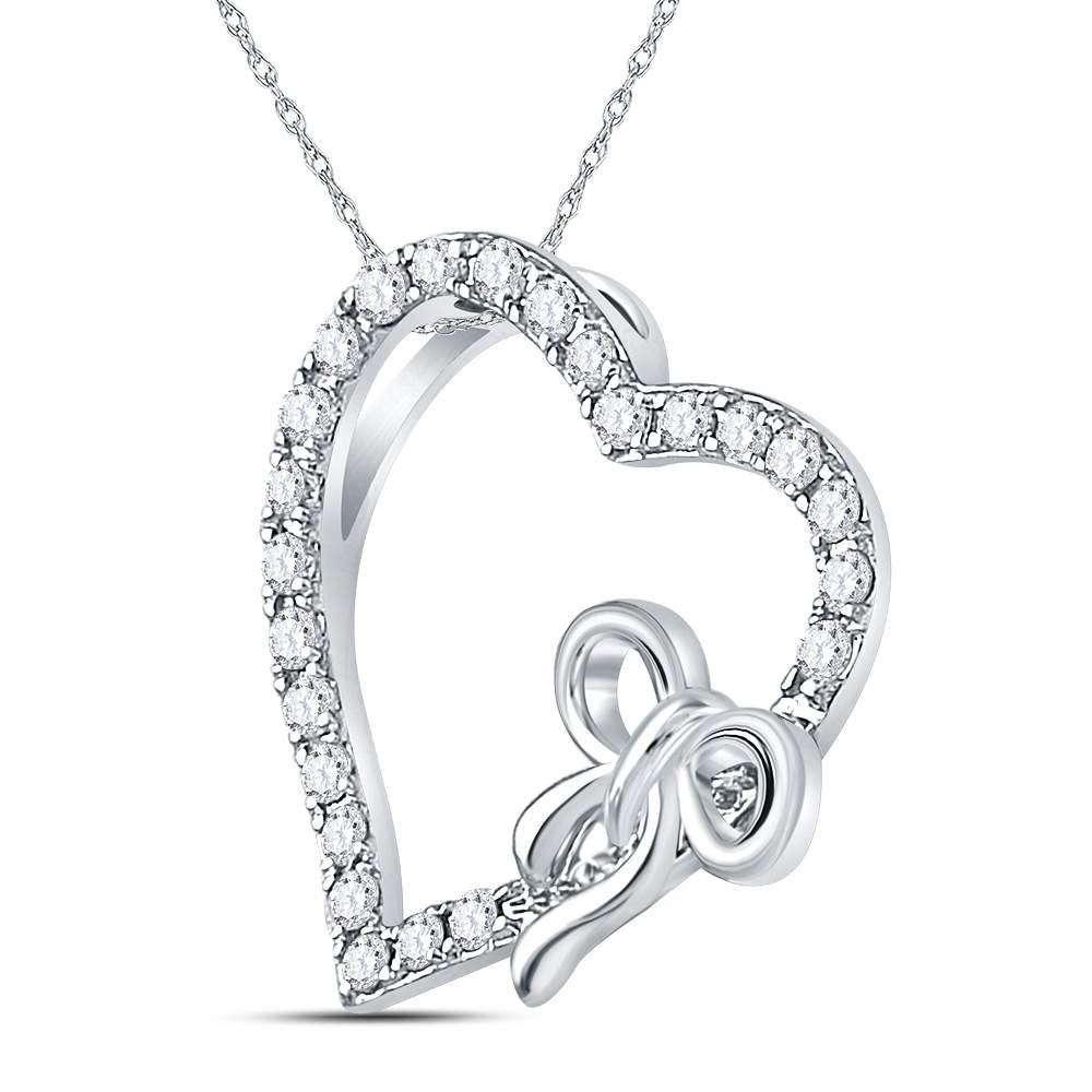 14kt White Gold Womens Round Diamond Heart Bow Pendant 1/4 Cttw