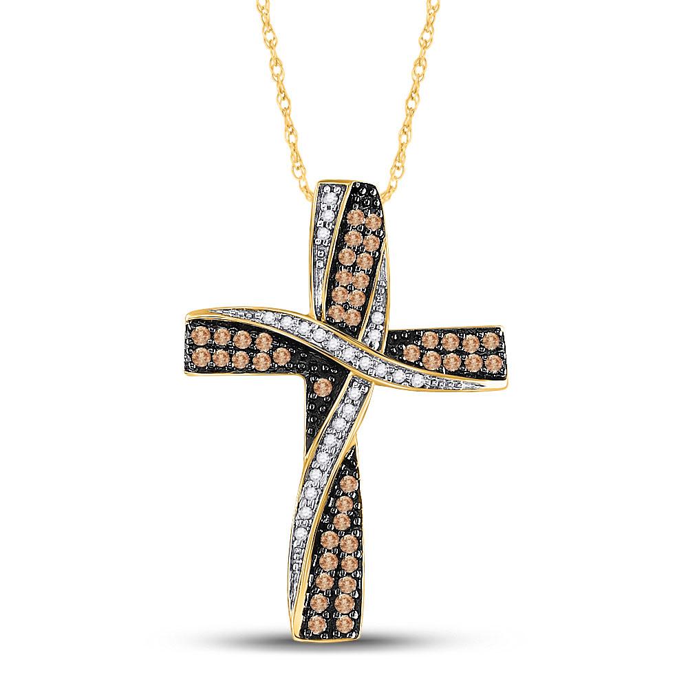 14kt Yellow Gold Womens Round Brown Diamond Bound Cross Pendant 1/2 Cttw
