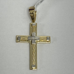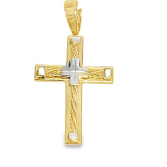 Elevate your style with this radiant cross pendant, meticulously crafted in lustrous yellow gold. The classic design showcases a unique rope-textured inlay that adds a touch of sophistication. A timeless emblem of faith and fashion, this pendant makes a meaningful statement, perfect for everyday wear or special occasions.